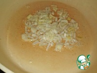 Пока варится рис. Мы нарезаем лук и выкладываем на разогретую сковородку для обжаривания. Регулярно перемешиваем. |