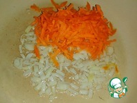 Натираем на терке морковь и выкладываем на сковородку, перемешиваем и солим по вкусу. |