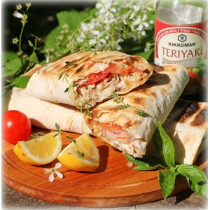 Приготовим соус для смазывания лаваша. Смешаем 2 ст. л. оливкового масла, 1 ст. л. лимонного сока, 1ст. л. соевого соуса-маринада Терияки ТМ Киккоман, 1ч. л. горчицы. |