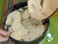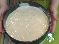 5. В заранее подготовленную жаропрочную форму выливаем большую часть теста, сверху равномерно выкладываем начинку и покрываем пирог оставшимся тестом. |