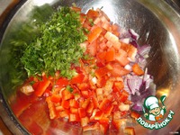 Mелко нарезать помидор, синюю луковицу, болгарский перец и зелень укропа, присолить и перемешать. |