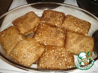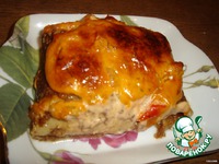 Заворачиваем начинку квадратом. Форму для выпекания смазать маслом и уложить в неё блинчики, вниз завёрнутой стороной. |
