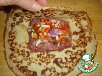 Hа центр блина кладём ст.ложку фарша, на фарш овощной начинки ст.ложку. |