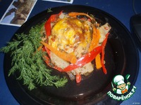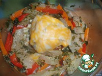 В кастрюльку нарезаем соломкой перец, морковь. Последней грушу, зелень. Выкладываем "яичко", смазываем майонезом. +1 ст.л. кипятка. На 5 мин СВЧ. |