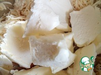 Добавить сливочное масло. Тут я немного отошла от рецепта, у меня был не большой кусок куриного вареного мяса. Решила мелко порезать и добавить. |