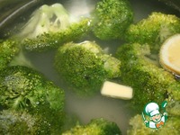 Брокколи разобрать на соцветия. Закипятить воду, посолить и добавить кусочек масла и лимонный кружок. Варить около 5 минут. Затем капусту достать и выложить на блюдо. |
