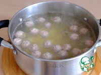 В кастрюлю добавить холодную воду (2,5 л.), при закипании выложить фрикадельки, варить 2-3 мин. При необходимости снять пену |