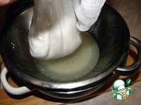 Отжать лишнюю жидкость и повесить марлю, чтоб стекли остатки сыворотки минут на 15-20 |