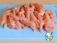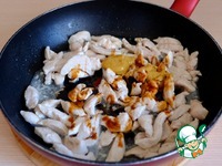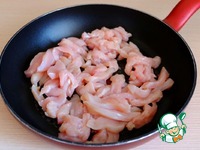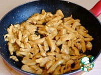 На сковороду добавить растительное масло (2 ст. ложки). Обжарить куриное филе на среднем огне в течение 3-5 мин. |