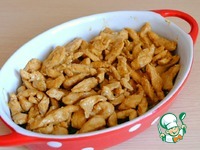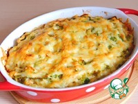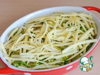 Приготовленной сметанно-яичной смесью полить сверху запеканку. Сыр натереть на терке, Посыпать сырной соломкой запеканку. Форму с запеканкой отправить в разогретый до t180С духовой шкаф. |
