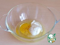 В миску добавить яйцо (1 шт.), добавить 2 ст. ложки сметаны, черный молотый перец, добавить 2 ст. ложки кипяченой воды. Смесь взбить вилкой |
