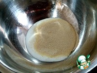 В теплый кефир насыпать дрожжи и дать им распуститься. Затем добавить сахар, соль и перемешать. |