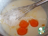 Белки взбить до тугих пиков, добавить оставшийся сахар и взбить. Ввести белки и муку в творожно-кефирную массу, аккуратно перемешать. |