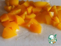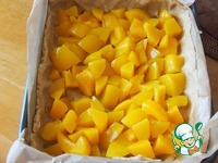Дно формы для выпечки застелить бумагой. Раскатать тесто и положить в форму. Вилкой сделать проколы. На тесто разложить персики. |