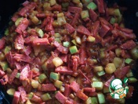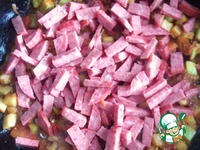 Когда корка кабачка станет мягкой добавляем нарезанную копченую колбасу. солим, перчим и красным и черным перцем! я люблю перченое и добавляю много красного) очень пикантно и вкусно! |
