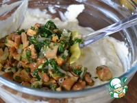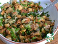 На сливочном масле обжарить лисички с белой частью лука. Постоянно помешивая, жарим 8 минут. Выкладываем в отдельную миску. |
