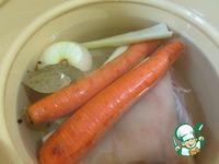Бульон с рулькой посолить и продолжать варить до полной готовности рульки. Затем достать рульку и дать полностью остыть. Бульон процедить. |
