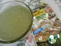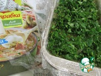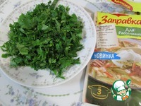 Затем все прикрыть зеленью + желатиновый бульон. |