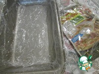 Форму для выпечки хлеба или кекса смочить холодной водой и застелить пищевой пленкой, чтобы свисали края. |