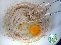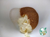 Размягченное сливочное масло взбить с белым и коричневым сахаром до пышной, кремообразной массы. |