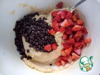 Добавить в тесто клубнику, нарезанную на небольшие кусочки, всыпать шоколадные капли, аккуратно перемешать. |