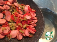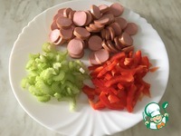 Сельдерей и перец режем соломкой. Сосиски режем кружочками. |