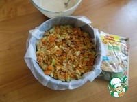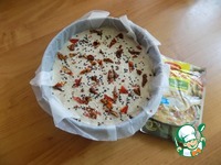 Я взяла разъёмную форму и застелила её пекарской бумагой. D-20 см и высота-5 см. Выкладываем 1/2 часть теста. |