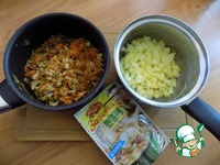 Картофель сварился, сливаем с него воду. Овощи тоже готовы. Не соединяем, мы начинку будем выкладывать слоями. |