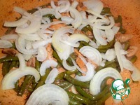 В сковороду к курице со стрелками добавить нарезанный лук, все жарить на маленьком огне минуты три, так же помешивая. |