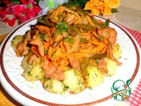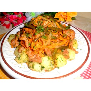 На картофель уложить курицу с овощами, подавать в горячем или теплом виде. Приятного аппетита! |
