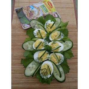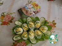 На тарелку выкладываем листья салата. На салатные листья выкладываем яичные белки (половинки). В половинки белков выкладываем желтковую массу. Украшаем зеленью и нарезанным огурцом. |