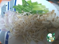 Режем перьями небольшую луковицу, сыр тофу - брусочками, зеленый лук - перьями где-то 3 см длиной. Выкладываем все горками на тарелку, туда же отдельной горкой - соевые проростки. |