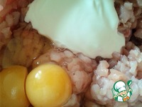 Чеснок пропустить через пресс. Смешать рубленное филе, грибы с луком, чеснок, измельчённую зелень, крахмал, сметану, посолить, поперчить и добавить яйца. |