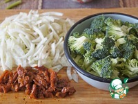 Фенхель разрезать вдоль и затем поперёк тонкими ломтиками, брокколи разобрать на мелкие соцветия. Помидоры нарезать полосками. |