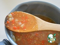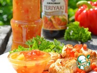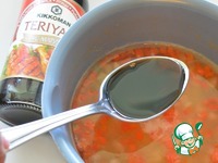 В сотейник влейте сироп с мякотью, добавьте вино, нарезанные кусочки ананаса и сладкого перца. Сюда же влейте соус Терияки Киккоман |