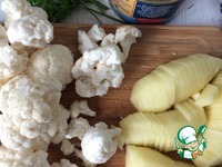 Картофель нарезать полукругами, зелень измельчить Цветную капусту разделить на соцветия. |