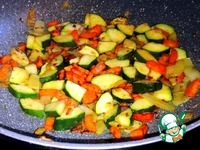 Жарила всё вместе минут 5. Сковороду закрыла крышкой и оставила на плите, пока подготавливала овощи и зелень. |