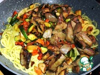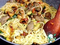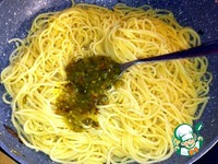 В эту же сковороду налила масло, выложила спагетти и заправку Магги. Обжаривала спагетти, пока не распределилась равномерно вся заправка. |