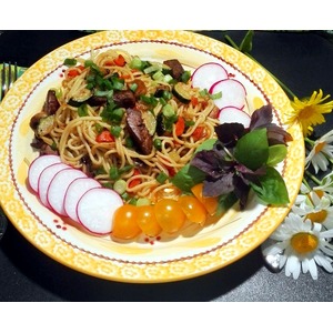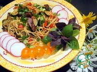 Спагетти разложила в порционные тарелки. Положила нарезанные овощи и зелень. Блюдо вкусное и сытное. |
