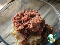Сначала нужно приготовить фарш. Для этого куриное филе потребуется пропустить через мясорубку или измельчить в блендере, вместе с луком и чесноком. Говяжий и куриный фарш соединить вместе, посолить. |