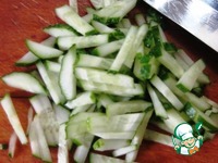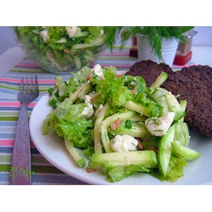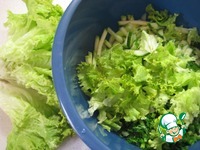 В миске соединить нарезанные кабачок, огурец, зелень и зеленый лук. Листья салата нарвать мелкими кусочками в миску к овощам. |