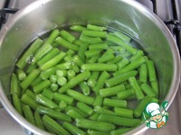 Если используем свежую фасоль, ее надо сначала помыть, обрезать кончики и нарезать кусочками по 2 – 3 см длиной. Фасоль опустить в кипящую подсоленную воду и варить 10 минут. |