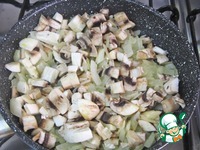 Жарить лук с 3 ст. л. оливкового масла в течение 5 минут, затем добавить шампиньоны, посолить, поперчить. |