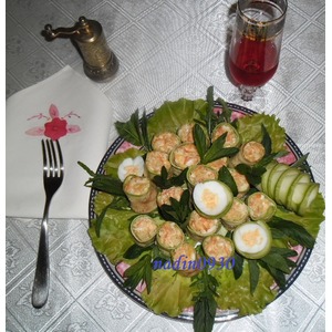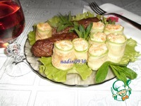 Полученной начинкой смазать каждый пласт подготовленных кабачков и закрутить рулетиками. На блюдо выложить зелень по вашему вкусу, сверху рулетики и подать как самостоятельное блюдо, |