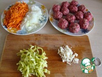 Пока нут варится, фарш посолить, поперчить, сформировать фрикадельки. Лук и чеснок мелко порезать, морковь и болгарский перец порезать соломкой. |