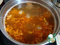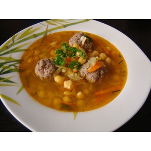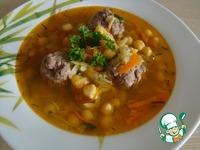 Через час после варки нута, положить к нему в кастрюлю фрикадельки, после закипания варить 5 минут и добавить зажарку. |