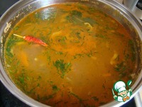 Посолить суп, добавить лавровый лист, перец горошек, чили и томить на медленном огне 20 минут. В конце добавить зелень и дать настояться 10 минут. |