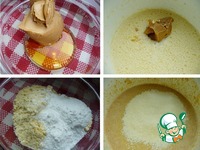 Добавить ореховую пасту с медом. Кукурузную муку смешать с разрыхлителем теста, просеять в массу, все взбить или перемешать лопаткой. |