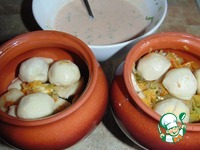 В горшочки выложить слоями овощи и обжаренные пельмени. Залить сметанным соусом. |