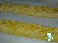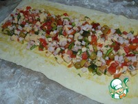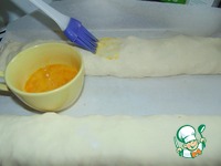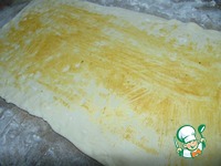 Размороженное слоеное тесто развернула и разрезала на две части. На каждую выложила ложку горчицы. |